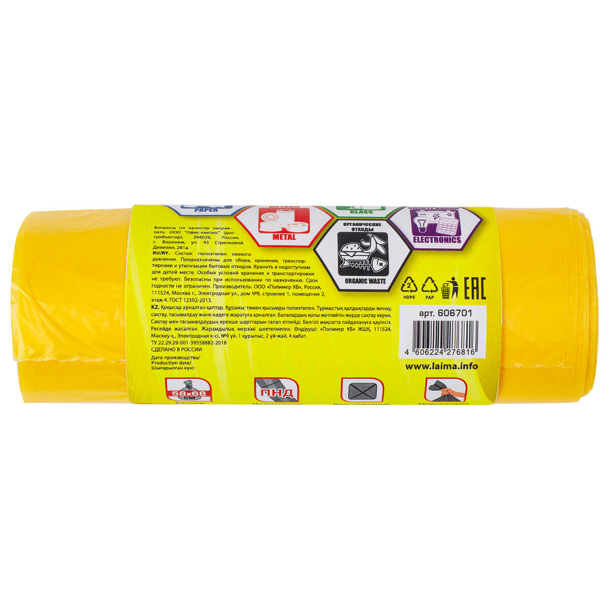 Мешки для мусора 60 л, желтые, в рулоне 20 шт., ПНД, 10 мкм, 680х580 мм, LAIMA, 606701